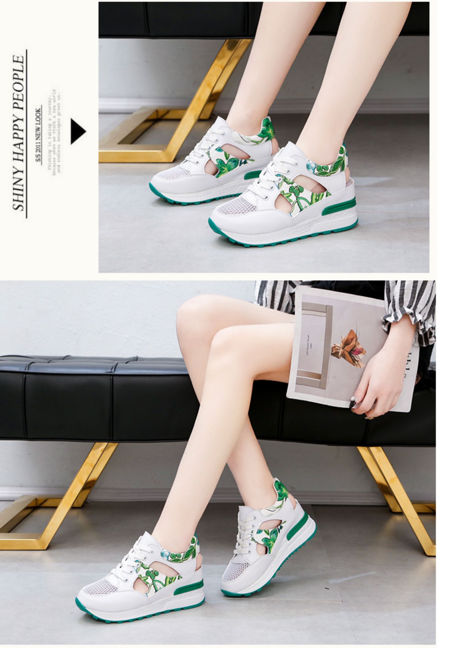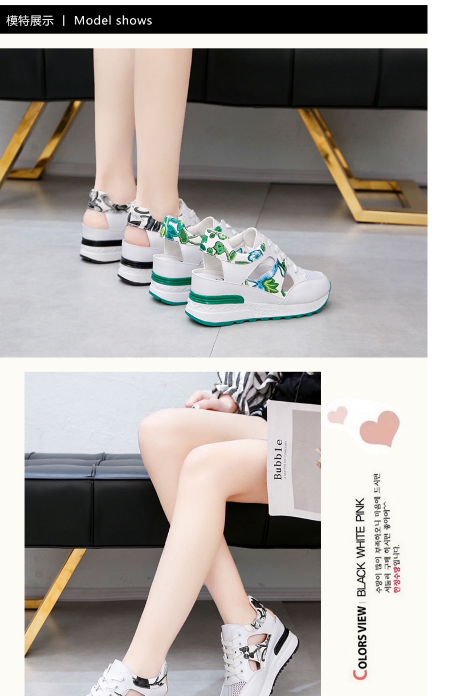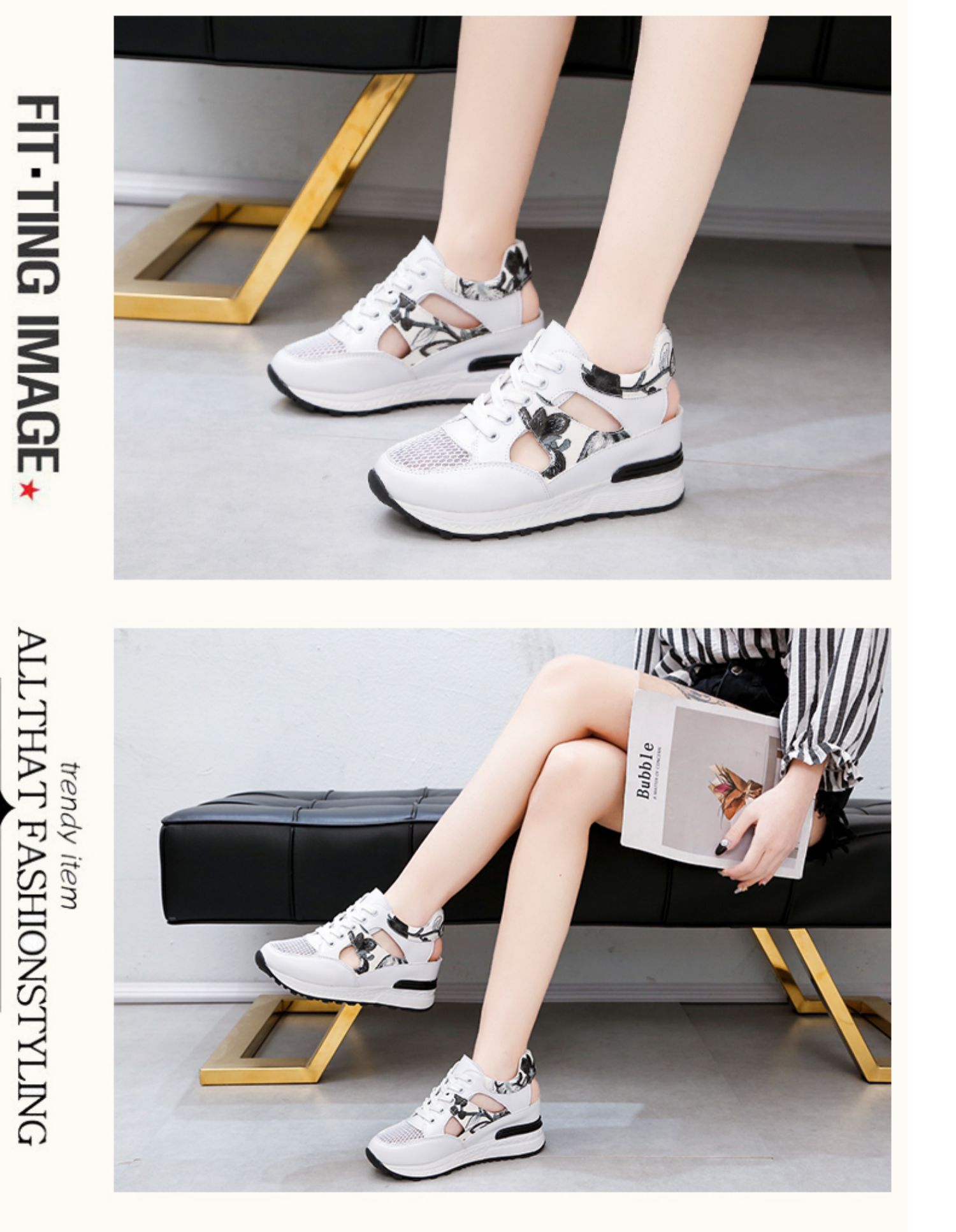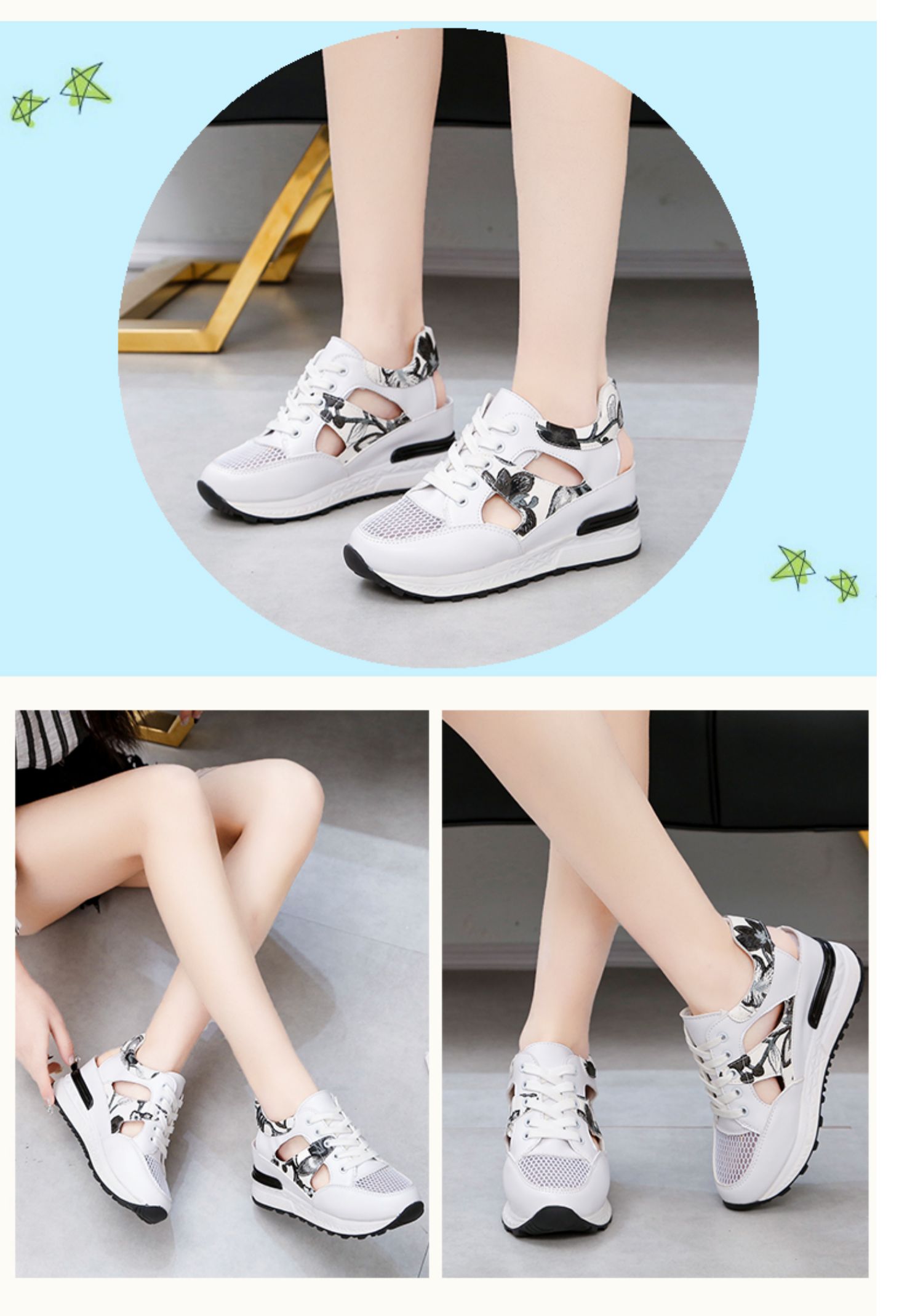 SUNTEK运动凉鞋女 夏季小白鞋包头镂空透气网面厚底内增高老爹鞋