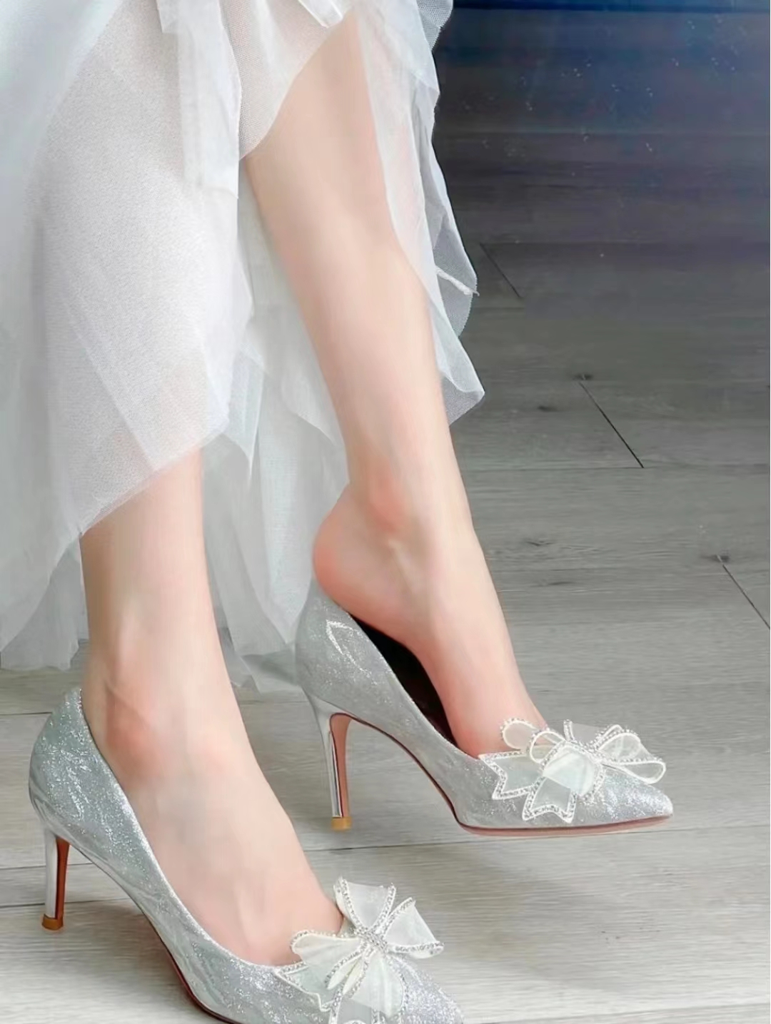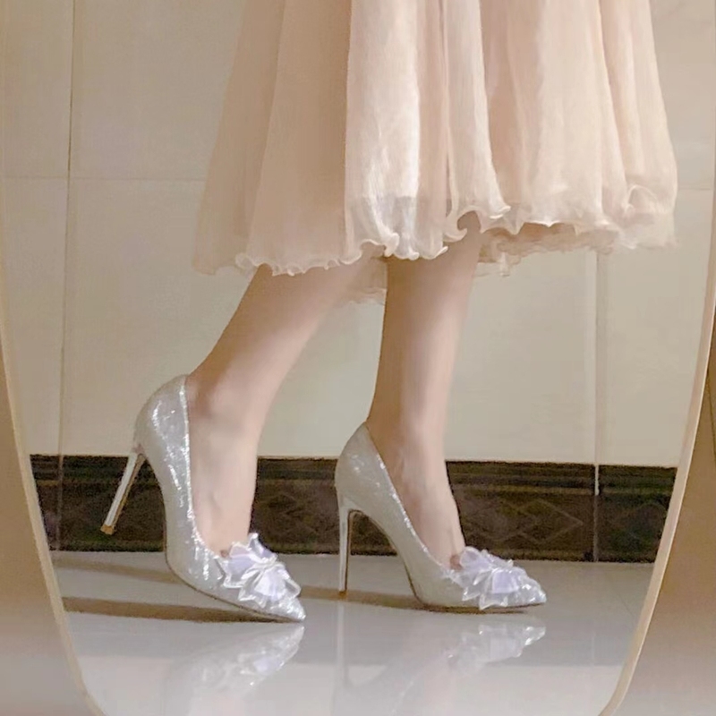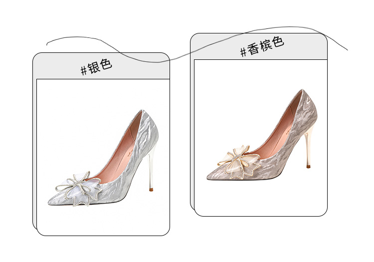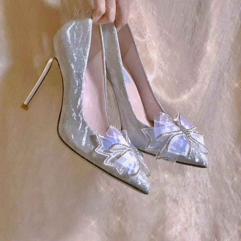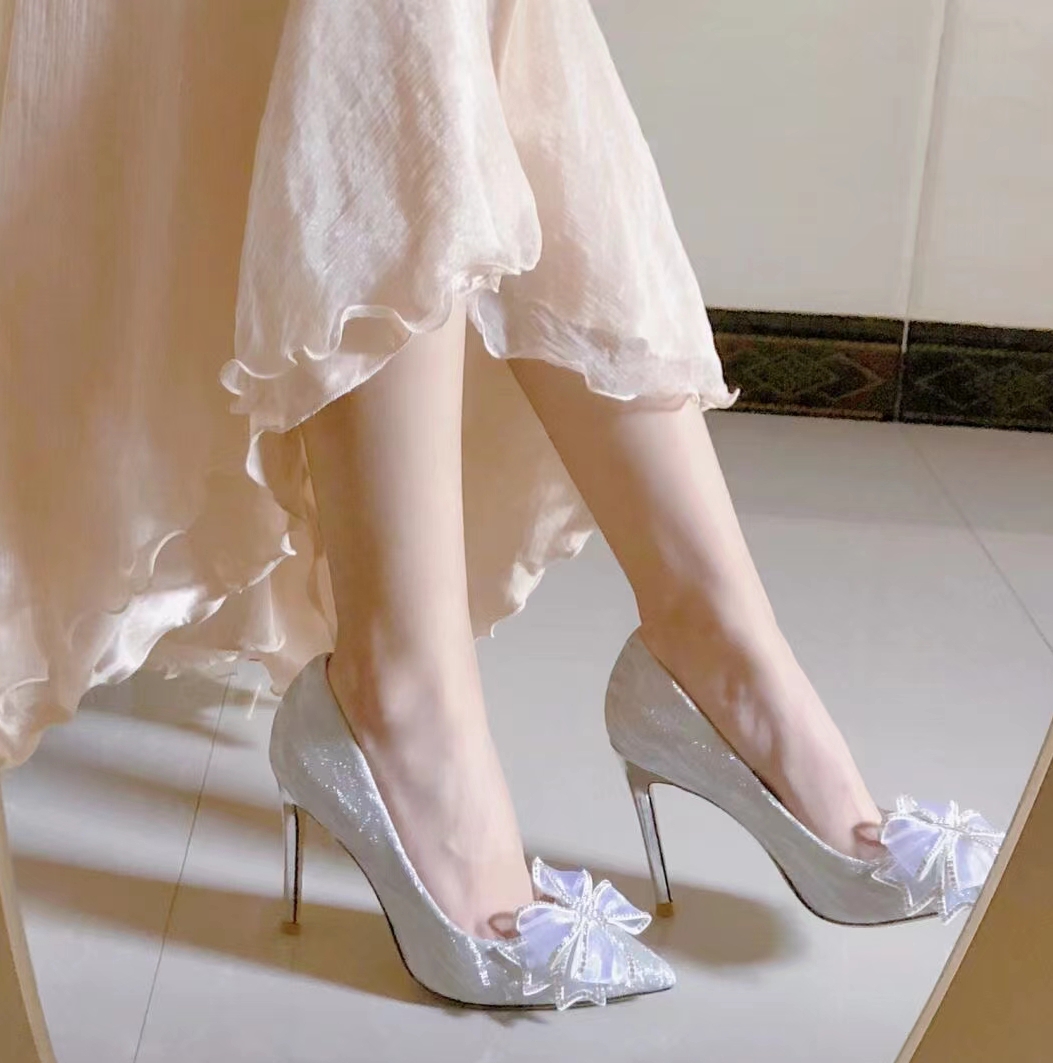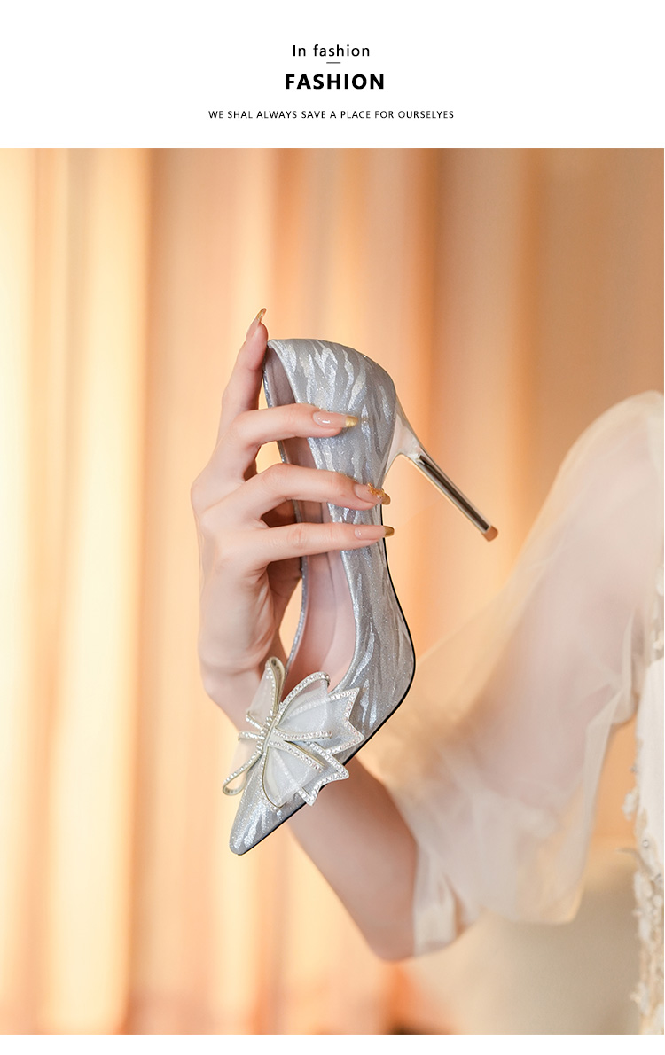 SUNTEK法式水晶鞋 春秋新款银色婚鞋水钻蝴蝶结尖头高跟鞋女细跟单鞋
