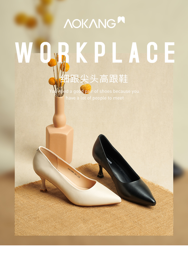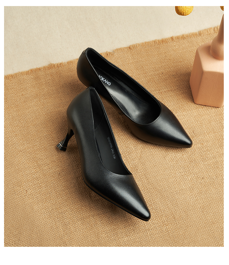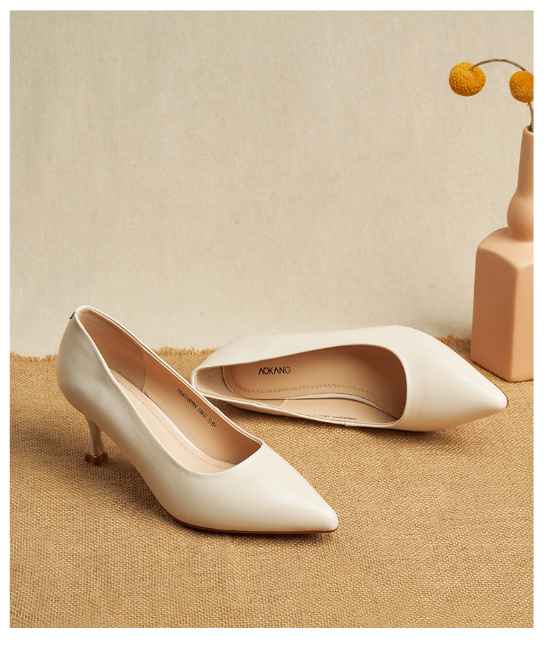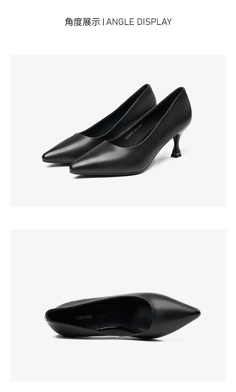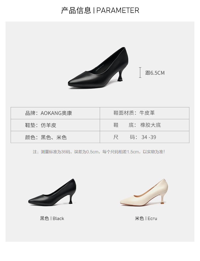 奥康女鞋新款细跟高跟鞋女牛皮尖头橡胶底空姐工作鞋上班职业鞋